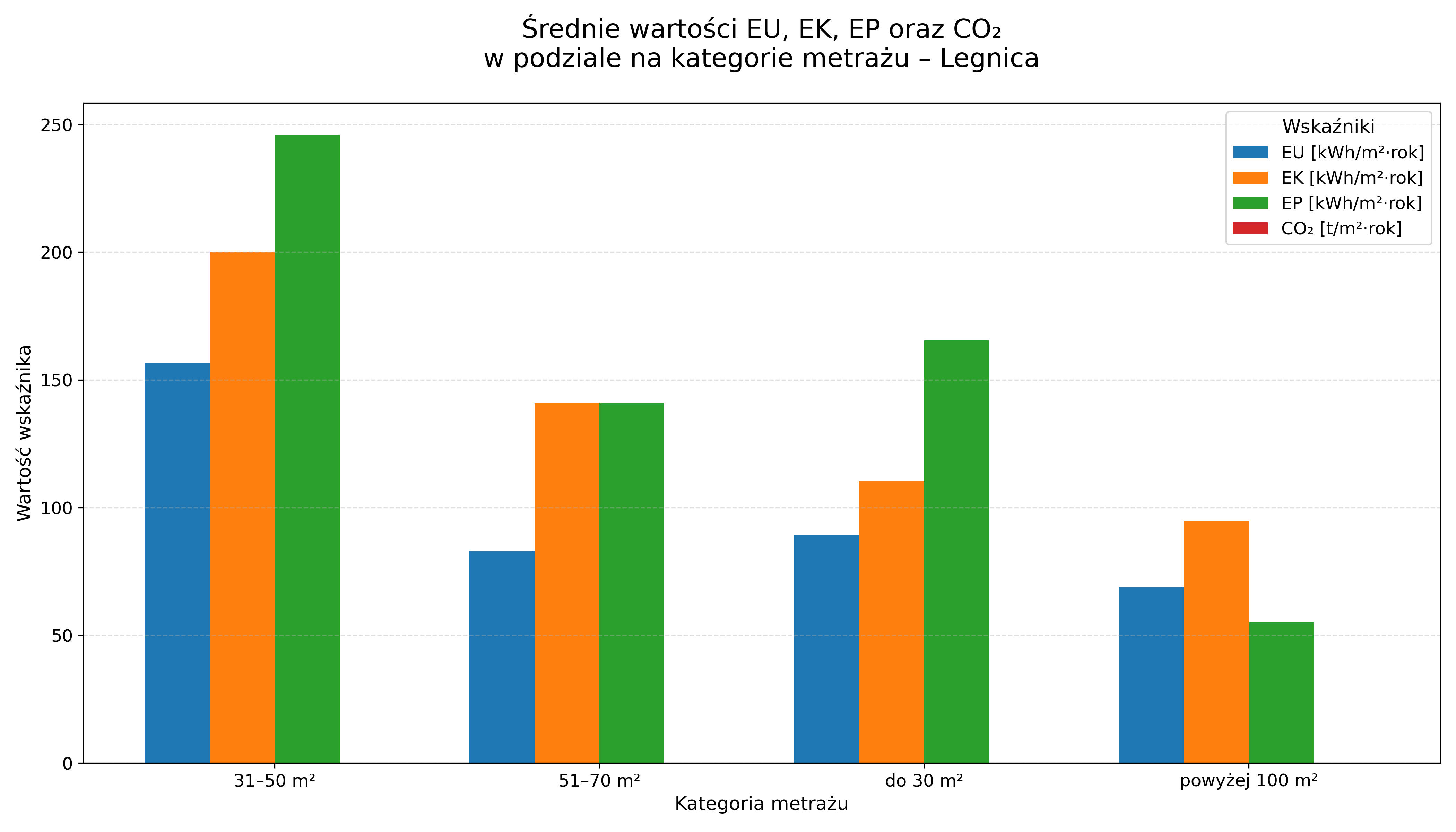 W najmniejszych lokalach widoczny jest wyższy poziom EP i EK, co sugeruje dominację starszej zabudowy. W większych mieszkaniach wartości stabilizują się, a w niektórych segmentach spadają dzięki nowoczesnym instalacjom.
